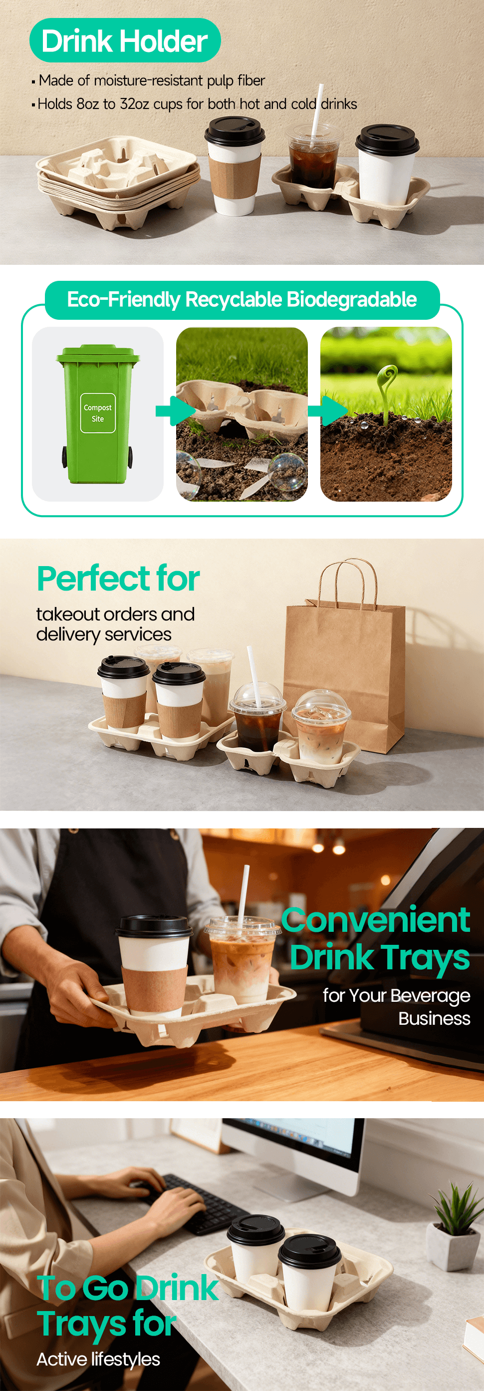 This eco-friendly molded pulp coffee cup carrier is thoughtfully designed for convenience and sustainability. Crafted from moisture-resistant pulp fiber, it securely holds up to four cups ranging from 8oz to 32oz—perfect for both hot and cold beverages. Ideal for takeout orders, delivery services, or busy active lifestyles, this recyclable and biodegradable drink tray offers an environmentally conscious solution without compromising durability or function. Elevate your beverage business with a convenient carrier that cares for the planet as much as your customers do.
